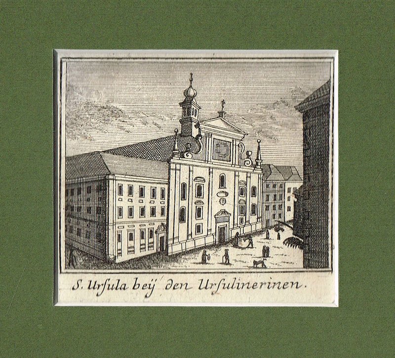 "S. Ursula bey den Ursulinerinen." Kupferstich aus M. Fuhrmann, Historische Beschreibung Und kurz gefaste Nachricht Von der Römisch. Kaiserl. und Königlichen Residenz-Stadt Wien Und Ihren Vorstädten, Wien 1765-70, 6 x 7,5 cm. - Kirche und Kloster in der Johannesgasse bzw. Seilerstätte; heute von der Universität für Musik und darstellende Kunst genutzt.