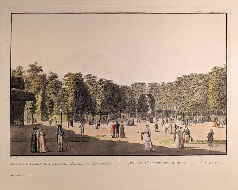 "Aussicht gegen die Seufzer Allee im Augarten." Altkolorierte Umrissradierung von Johann Ziegler bei Artaria, 2. Etat (von 3), Wien um 1794, 27,5 x 42 cm. - Ein Teil des Barockgartens mit promenierender Gesellschaft in Empirekostümen.