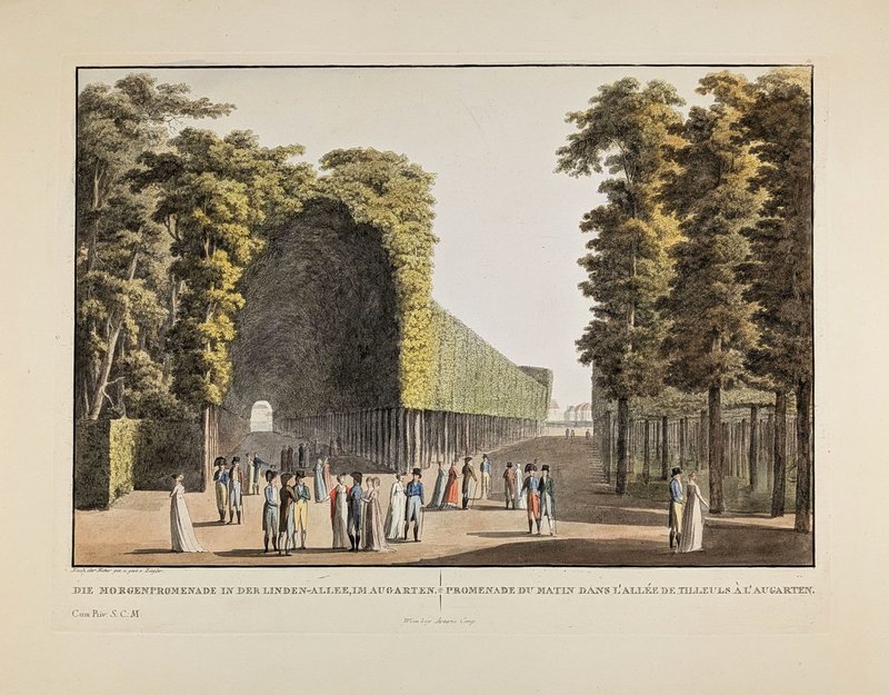 "Die Morgenpromenade in der Linden-Allee, im Augarten." Altkolorierte Umrissradierung von Johann Ziegler bei Artaria, 3. Etat (von 3), Wien um 1805, 27,5 x 42 cm. - Ein Teil des Barockgartens mit promenierender Gesellschaft in Empirekostümen.
