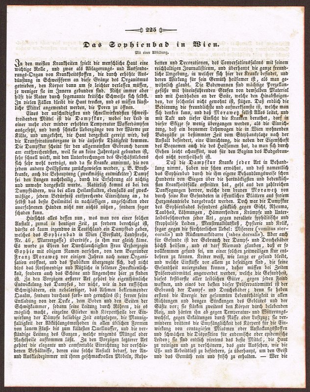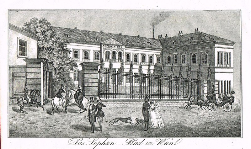 "Das Sophien-Bad in Wien." Federlithographie bei Carl Wilhelm Medau aus "Erinnerungen an merkwürdige Gegenstände und Begebenheiten ..." 24. Jg., 1844, 9,5 x 17 cm. - Blick auf das 1838 eröffnete "russische Dampfbad"; es wurde um 1845 durch einen Neubau ersetzt, der sowohl als Schwimmbad wie später auch als Ball- und Mehrzwecksaal diente. Zugehöriger Text beiliegend.