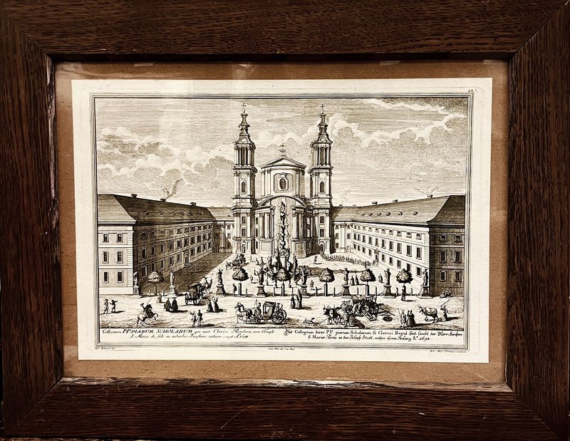 "Das Collegium derer PP. piarum Scholarum, ... sambt der Pfarr=Kirchen S. Mariae-Treu in der Joseph Stadt ...". Kupferstich von Johann August Corvinus nach Salomon Kleiner aus S. Kleiner - J. A. Pfeffel, Vera et accurata delineatio, 1. Teil, Augsburg 1724, 22 x 33 cm. - Gleichmäßig beschnitten und auf Karton montiert. Gerahmt.