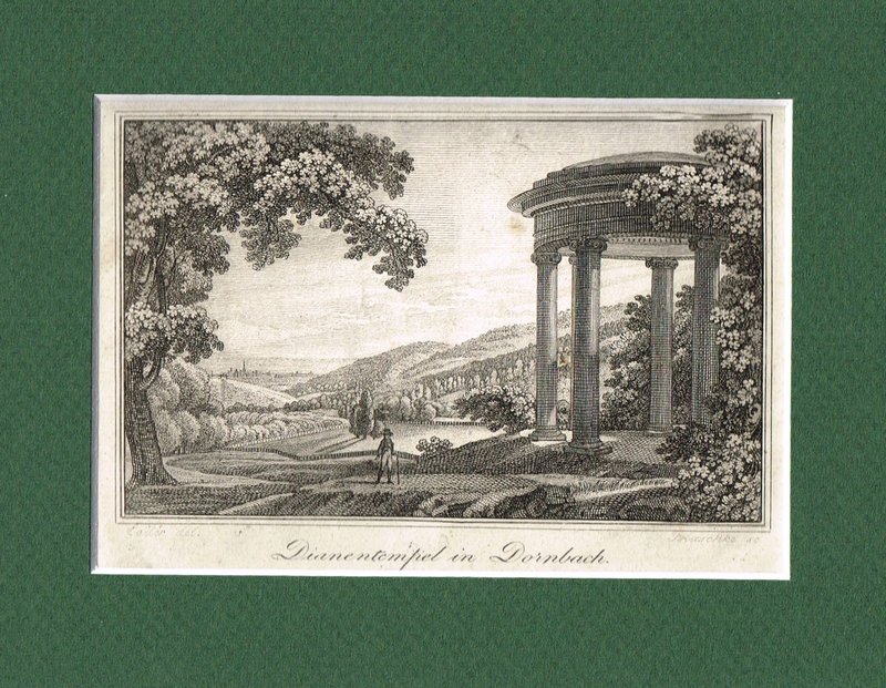 "Dianentempel in Dornbach." Kupferstich von J. Blaschke nach Matthäus Loder aus "Mahlerische Streifzüge durch die interessantesten Gegenden um Wien", Wien 1807, 7,5 x 12 cm. - Der klassizistische Rundtempel im "englischen Garten" des Feldmarschalls Moritz Graf Lacy (heute Schwarzenbergpark); im Hintergrund die Stadt Wien.