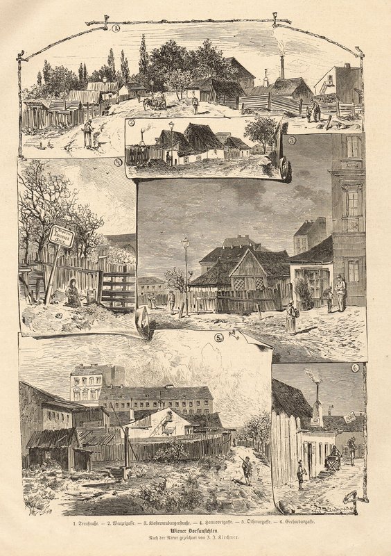 "Wiener Dorfansichten." Holzstich nach Johann Josef Kirchner aus "Neue Illustrirte Zeitung", 1877, 31 x 22 cm. - Sammelblatt mit sechs ländlichen, noch nicht von der gründerzeitlichen Verbauung des Bezirks geprägten Straßenszenen: Treustraße, Wenzelgasse, Klosterneuburgerstraße, Hannovergasse, Othmargasse, Gerhardusgasse. - Papierbedingt gebräunt.