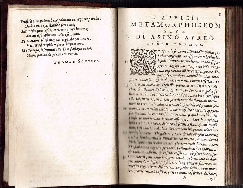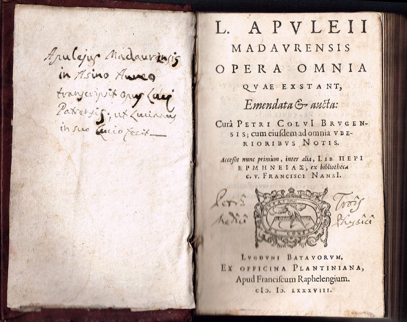 USTC 422673; Adams A 1368 (nur Tl. 1); Graesse I, 171; Schweiger II 1, 9. - Von Petrus Colvius (1564-1594) besorgte Ausgabe, die erstmals die Schrift "Peri hermeneías" enthält und von den Zeitgenossen hoch geschätzt wurde. - Beibindung: USTC 406754; Adams S 1861; Voet 2262. - Der römisch-numidische Schriftsteller und Philosoph Lucius Apuleieus (2. Jh. n. Chr.) verdankt seinen bleibenden Ruhm dem lateinischen Roman "Metamorphosen" (auch "Der goldene Esel"), der zur Weltliteratur gezählt wird und bis heute anregend auf die Literatur und Kunst gewirkt hat. Die 1555 von Christophe Plantin (Christoffel Plantijn) in Antwerpen gegründete Offizin war eine der größten ihrer Zeit und gilt als die erste industrielle Buchdruckerei; 1582 erfolgte die Gründung einer Filiale in Leiden, die drei Jahre später von Plantins Schwiegersohn Franciscus Raphelengius (Frans van Ravelingen) übernommen wurde.