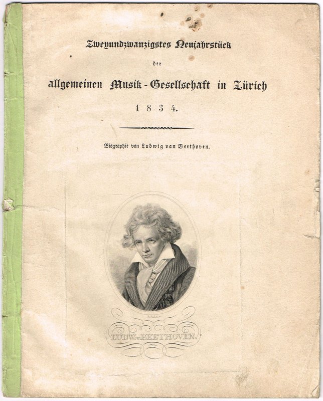 Biographie von Ludwig van Beethoven. Zweyundzwanzigstes Neujahrstück der allgemeinen Musik-Gesellschaft in Zürich 1834. (Zürich, Musik-Gesellschaft, 1833). Gr-8; Umschlag (zugleich Titel) mit gestochener Porträt-Vignette, Aquatinta-Frontispiz, 16 pp; Fadenheftung mit Papierstreifen am Rücken; äußere Seiten angeschmutzt und etwas mürbe, stellenweise fleckig, einzelne kleine Papierschäden.