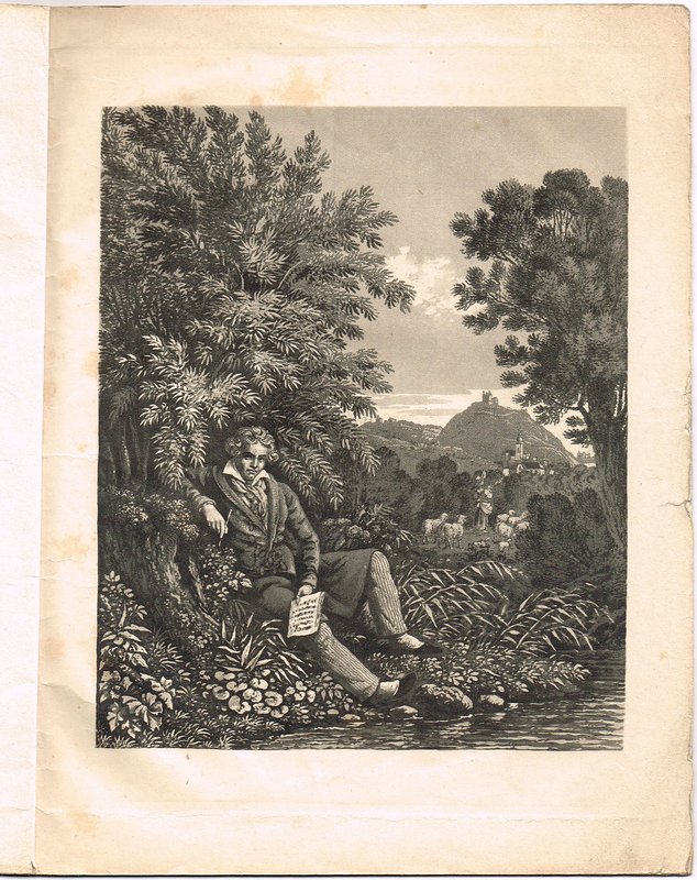 Frühe Kurzbiographie Beethovens mit Werkverzeichnis und zwei Porträts als Jahresgabe der 1812 gegründeten Züricher Musikgesellschaft. Das Titelmedaillon von Rudolf Rahn entstand nach dem Gemälde von Joseph Stieler aus dem Jahr 1820, die Aquatintatafel zeigt Beethoven beim Komponieren der "Pastorale" im romantischen Helenental bei Baden bei Wien und wurde vom Künstler Franz Hegi (1774-1850) geschaffen. Der Verfasser und Herausgeber Johann Georg Bürkli (1793-1851) war in Zürich politisch, militärisch und kulturell aktiv.