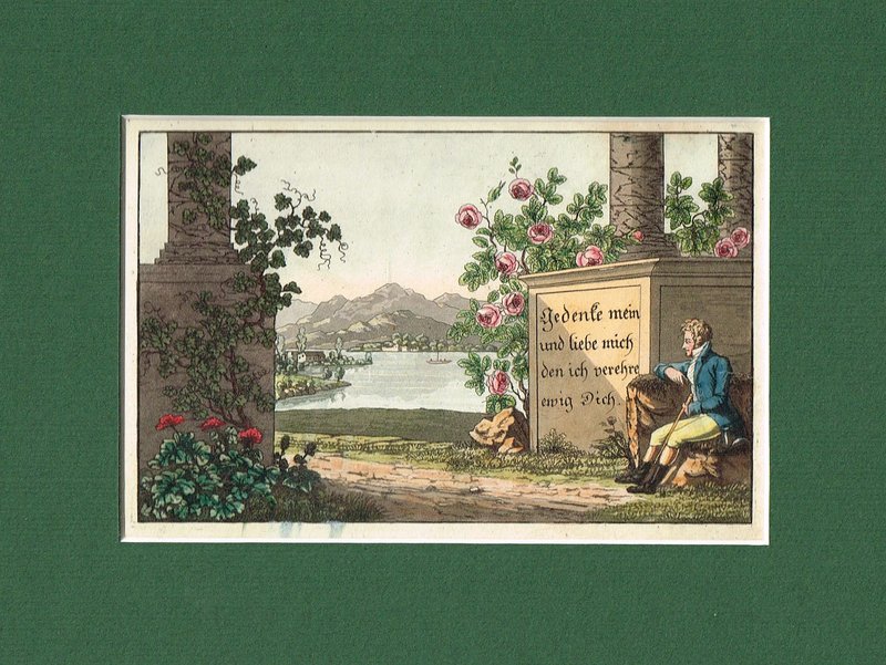 "Gedenke mein / und liebe mich / den(!) ich verehre / ewig Dich." Kolorierte Aquatintaradierung um 1830, 7 x 11 cm. - Kleiner unterlegter Randriss, Wischspur im weißen Rand.