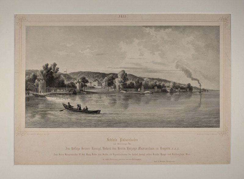 "Schloss Possenhofen am Starnberger-See ..." Stahlstich 1853 von Jobst Riegel nach Carl August Lebschée bei W. Wick, München 1853, 26 x 49,5 cm. - Die 1834 von Herzog Max in Bayern erworbene Schlossanlage, in der Kaiserin Elisabeth die Sommer ihrer Kindheit und Jugend verbrachte. - Etwas gebräunt, mehrere Risse (teilweise bis in die Bordüre reichend) im breiten, etwas ungleichmäßig beschnittenen Rand.
