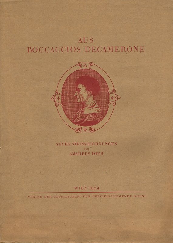 "Aus Boccaccios Decamerone". Wien, Verlag der Gesellschaft für vervielfältigende Kunst, 1924. Flügelmappe (bedruckte Orig.-Broschur) mit einem Textblatt und sechs teils mehrfarbigen, im Stein signierten Lithographien; in-folio. - Die Mappe geringfügig angeschmutzt und mit kleinen Läsuren, die Blätter tadellos.