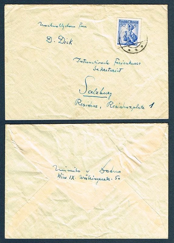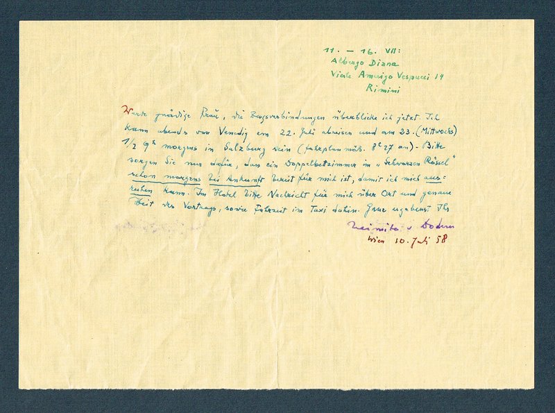 Eigenhändiger Brief mit Unterschrift, quer-8, Wien, 10. 7. 1958. - An Frau D. Dick vom Sekretariat der Internationalen Ferienkurse in Salzburg über einen geplanten Vortrag. "Werte gnädige Frau, die Zugsverbindungen überblicke ich jetzt. Ich kann abends von Venedig am 22. Juli abreisen und am 23. (Mittwoch) 1/2 9h morgens in Salzburg sein (fahrplanmäß. 8h27 an). Bitte sorgen Sie nur dafür dafür, dass ein Doppelbettzimmer im 'Schwarzen Rössel' schon morgens bei Ankunft bereit für mich ist, damit ich mich ausruhen kann. Im Hotel bitte Nachricht für mich über Ort und genaue Zeit des Vortrags, sowie Fahrzeit im Taxi dahin. Ganz ergebenst Ihr Heimito v. Doderer". Oberhalb des Brieftextes ist die Adresse Doderers vom 11.-16. Juli in Rimini angegeben. Mit eigenhändigem Briefkuvert. - Wie meist bei Doderer in mehreren Tintenfarben geschrieben; leichter Abklatsch der Unterschrift auf der gegenüberliegenden Seite der Faltspur, Brief und Kuvert etwas knittrig.