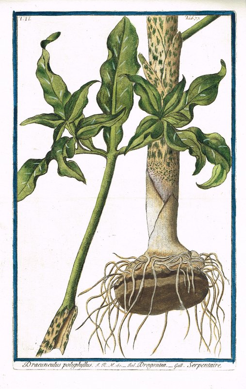"Dracunculus polyphyllus ...". Altkolorierter Kupferstich mit lateinischer, italienischer und französischer Beschriftung aus Giorgio Bonelli, Hortus Romanus, Rom 1772-1793, Bildformat 36 x 23 cm, Blattgröße 55 x 39 cm. - Gemeiner Drachenwurz (auch Schlangenwurz, Dracunculus vulgaris). Breitrandiger Abzug mit feinem Kolorit. - Kaum sichtbare horizontale Quetschfalte, im weißen Rand minimal fleckig, rückseitig angeschmutzt, insgesamt sehr dekorativ.
