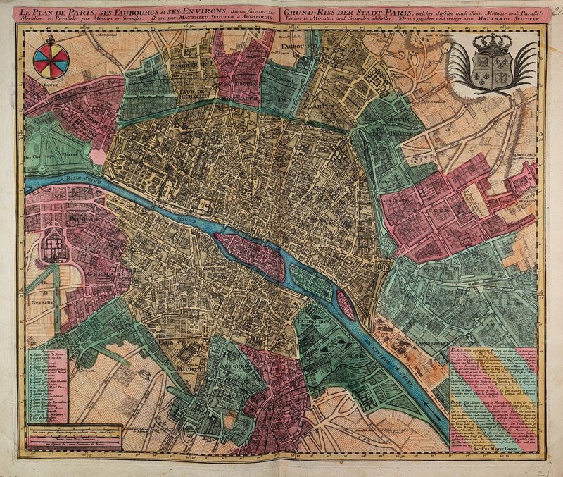 "Le plan de Paris, ses Faubourgs et ses Environs ... / Grund-Riss der Stadt Paris, welcher dieselbe nach ihren Mittags- und Parallel-Linien in Minuten und Secunden abtheilet ...". Altkolorierte Kupferstichkarte bei Matthäus Seutter, Augsburg, um 1740, 47 x 57 cm. - Sehr gut erhaltener farbfrischer Stadtplan von Paris und seinen Vorstädten.