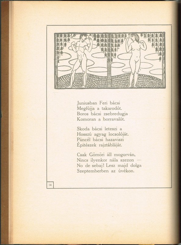 Megfagyott muzsikus 1912. Budapest, Nyugat Irodalmi és Nyomdai Részvénytársaság, 1912. In-4; 86 pp, 5 Bll. Anzeigen; durchgehend lithographisch illustriert; illustr. Orig.-Kartonierung (der ursprünglich vorstehende Umschlag auf Buchblockgröße beschnitten, etwas gedunkelt und geringfügig berieben, der hintere Deckel mit einem kleinen und einem etwas größeren Einriss); innen tadellos. - Dazu als Beigabe: Diszitö müvészet 1914/1. Einzelheft der ungarischen Zeitschrift für dekorative Kunst, stärker beschädigt und unkomplett.