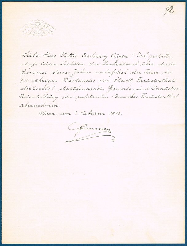 Diktatbrief mit eigenhändiger Unterschrift, 1/2 Seite, kl-4, Wien, 4. 2. 1913. - "Lieber Herr Vetter Erzherzog Eugen! Ich gestatte, daß Euer Liebden das Protektorat über die im Sommer dieses Jahres anläßlich der Feier des 700 jährigen Bestandes der Stadt Freudenthal dortselbst stattfindende Gewerbe- und Industrie-Ausstellung des politischen Bezirkes Freudenthal übernehmen." Mit kleinem blindgeprägtem Wappen. - Leichte Faltspur, rechts oben Empfängervermerk in Bleistift.