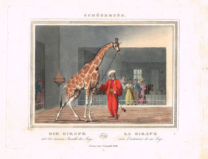 "Schönbrunn. Die Girafe in der innren Ansicht der Loge." Altkolorierter Kupferstich mit Aquatinta (wohl von Eduard Gurk) aus "Wiens Umgebungen" bei Tranquillo Mollo, Wien um 1828, 11 x 15 cm. - Die im August 1828 als Geschenk des ägyptischen Vizekönigs Mehmed Ali an Kaiser Franz I. eingetroffene erste Giraffe in der Wiener Menagerie mit ihrem arabischen Wärter Hadschi Ali Sciobari. - In der Bordüre und im weißen Rand etwas fleckig, sonst wohlerhalten und farbfrisch. Von größter Seltenheit.