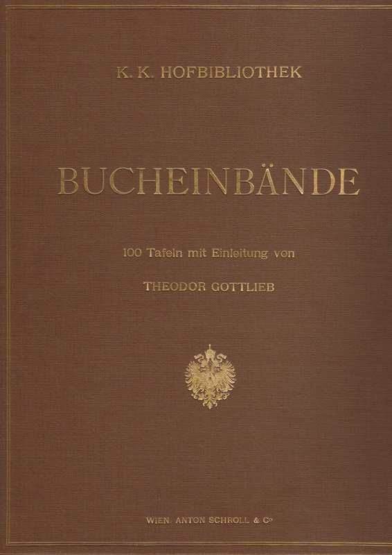 K. k. Hofbibliothek. Bucheinbände. Auswahl von technisch und geschichtlich bemerkenswerten Stücken. Einleitung und Tafelteil. Wien, Anton Schroll, (1910). Gr-folio; Einleitung 2 Bll., 80 Sp., S. 81-84; flexibles Orig.-Leinen; Tafelteil 1 Bl., 100 teils farbige lose Tafeln in Licht- und Steindruck; zusammen in goldgepr. Orig.-Leinenmappe mit Bindebändern in blindgepr. Orig.-Pappschuber; Schuber leicht beschädigt, ein Bindeband gerissen, sonst sehr schönes Exemplar mit nur unbedeutenden Gebrauchs- und Altersspuren.