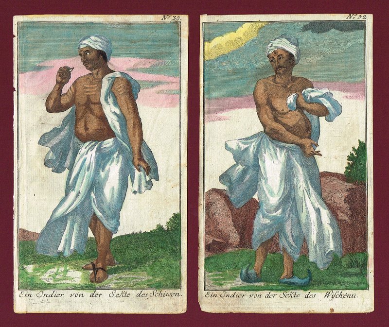 "Ein Indier von der Sekte des Schiwen" - "Ein Indier von der Sekte des Wischenu". Zwei altkolorierte Kupferstiche aus Friedrich Eckart, Beytrag zu einer redenden Naturlehre und Physiognomik der Menschheit bei C. Weigel und Schneider, Nürnberg 1786, je 15,5 x 9 cm. - Druckbedingt knapprandig, Altersspuren.