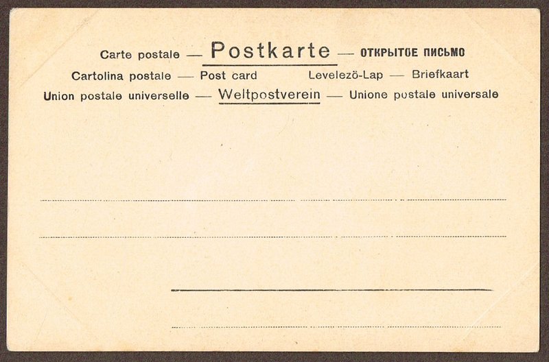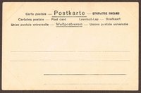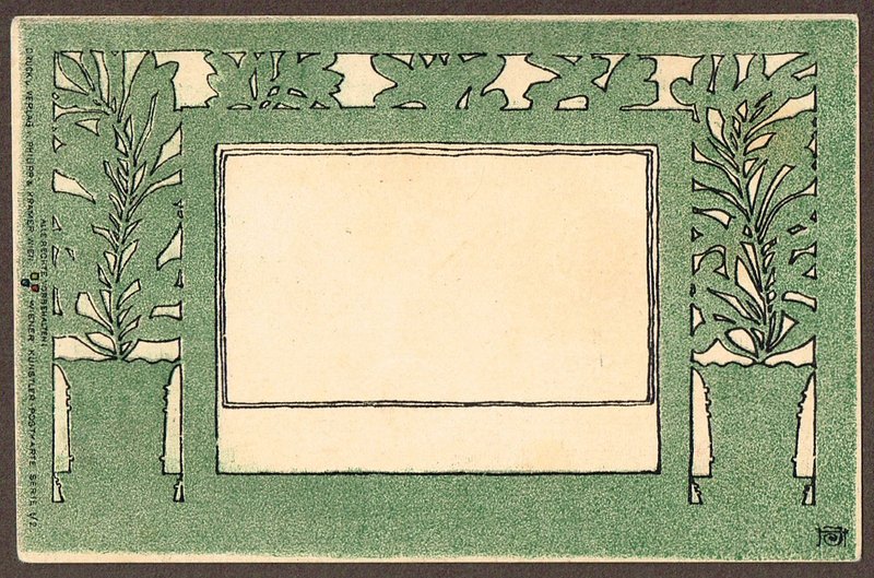 Postkarte für den Weltpostverein. Chromolithographie bei Philipp & Kramer, Wien um 1897, rechs unten im Stein monogrammiert J H. - Weißes Schriftfeld umgeben von floraler Jugendstil-Bordüre in Grün und Schwarz. Ungelaufen. - Die vier Ecken mit schrägen Druckspuren (meist nur auf der Rückseite sichtbar).
