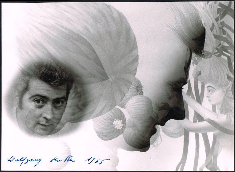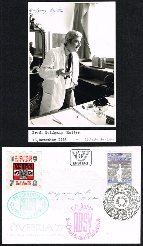 Fotoporträt in Postkartengröße mit eigenhändigem Namenszug auf der Bildseite, zusammen mit dem Ersttagskuvert zu einer von Hutter entworfenen Briefmarke auf Karton montiert, das Kuvert ebenfalls signiert, (Wien) 2. 12. 1977. - Beiliegend eine Fotomontage (Porträtkopf in Gemälde, Foto Martin Kainz, Wien) 17,5 x 24 cm mit eigenhändigem Namenszug auf der Bildseite, 1965; am oberen Rand etwas unregelmäßig beschnitten.