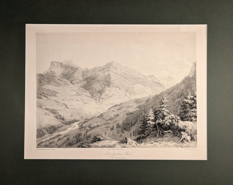"Das Grödner Thal. Von Pufels aus gesehen." Lithographie mit Tonplatte von Eberle nach August Podesta aus "Album von Tyrol und Salzburg" bei Literar.-artist. Anstalt, München 1838-41, 26 x 36 cm. - Das obere Grödener Tal mit den ladinischen Ortschaften St. Ulrich und St. Jakob; hinten der Langkofel.