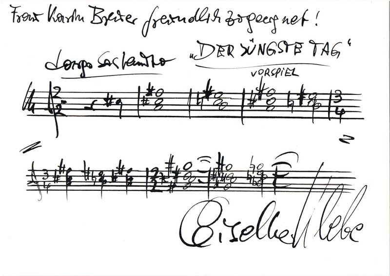 Billet mit zwei eigenhändigen Notenzeilen, Widmung und Unterschrift, quer-12, um 1980. - 7 Takte aus "Der jüngste Tag" (Vorspiel, Largo sostenuto).