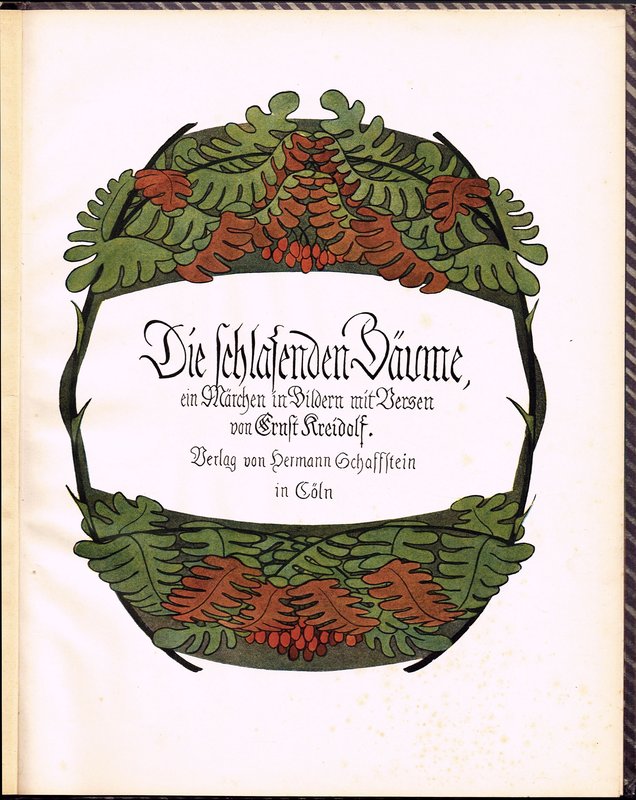 Die schlafenden Bäume, ein Märchen in Bildern mit Versen von Ernst Kreidolf. (4. Aufl.) Köln, Hermann Schaffstein, (um 1930). In-4; (12) pp, durchgehend farbig illustriert; illustr. Orig.-Pappband mit illustrierten Vorsätzen im Irisdruck. - Leichte Gebrauchs- und Altersspuren.