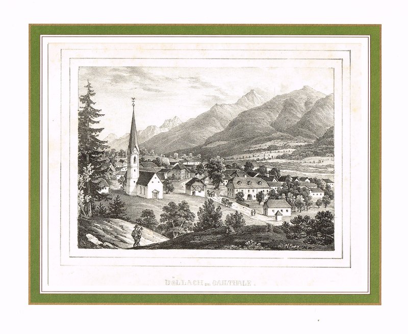 "Döllach im Gailthale." Lithographie aus Joseph Wagner, Album für Kaernten, Klagenfurt 1845, 13 x 18 cm. - Gesamtansicht. - Im breiten Rand leicht fleckig.