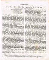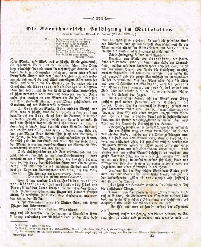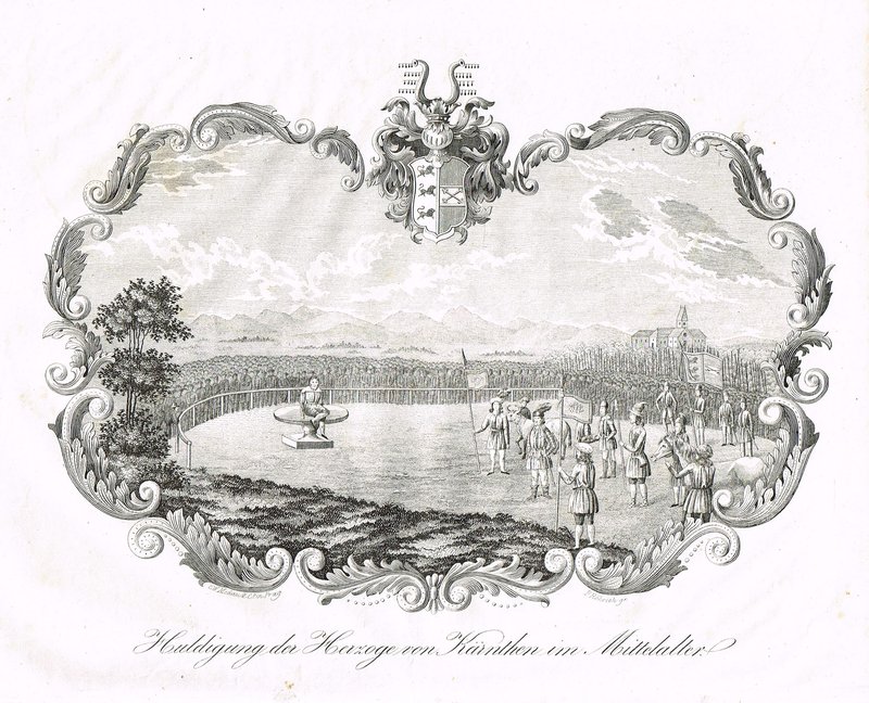 "Huldigung der Herzoge von Kärnthen im Mittelalter." Federlithographie von P. Röhrich bei Carl Wilhelm Medau aus "Erinnerungen an merkwürdige Gegenstände und Begebenheiten ..." 24. Jg., 1844, ca. 15 x 21 cm. - Phantasievolle Darstellung vom Ritual der Kärntner Herzogseinsetzung im Blachfeld bei Karnburg. Der hier nur ungenau wiedergegebene "Fürstenstein" (nicht zu verwechseln mit dem Kärntner Herzogstuhl) stammt aus der römischen Stadt Virunum auf dem Zollfeld und befindet sich heute im Klagenfurter Landhaus. Zugehöriger Text beiliegend.