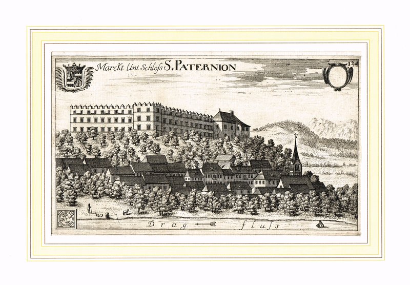 "Marckt Unt Schloß S. Paternion". Kupferstich von Andreas Trost nach Johann Weichard Valvasor aus J. W. Valvasor, Topographia Archiducatus Carinthiae, Laibach 1681, 12 x 21 cm. - Der Ort mit der Schlossanlage, im Vordergrund die Drau. - Nicht störende leichte Flecken im weißen Rand.