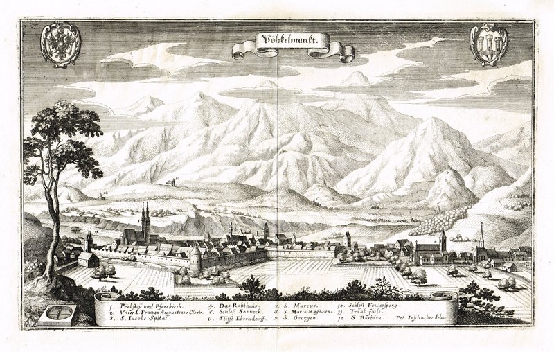 "Völckelmarckt." Kupferstich nach Peter Leschacher aus Matthäus Merian, Topographia Provinciarum Austriacarum, Frankfurt 1649, 19 x 32 cm. - Gesamtansicht mit den Karawanken im Hintergrund. - Geglätteter druckbedingter Mittelbug, nicht störende kleine Papiermängel.