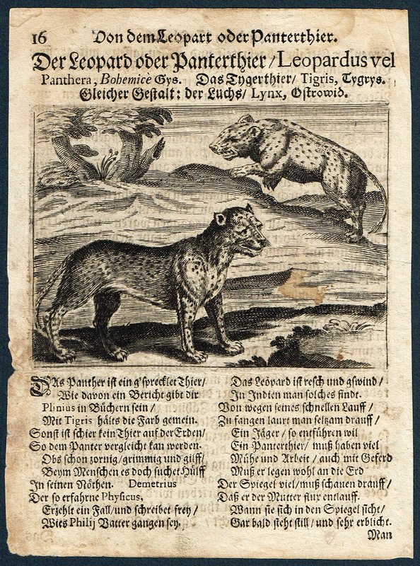 "Der Leopard oder Panterthier / Leopardus vel Panthera, Bohemice Gys." Kupferstich mit Gedicht auf ganzer Buchseite aus Johann Christoph Sartorius, Neues Thier-Buch, Oder: Merckwürdige Beschreibung Der Thieren und Vögeln ..., Prag 1718, Bildformat 8 x 11 cm, Blattgröße 18 x 13 cm. - Etwas fleckig und feuchtrandig.