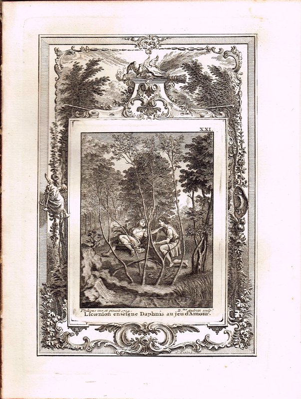 Cohen-de Ricci 653; Reynoud 317; Sander 1226; Brunet III, 1158. - Schöne Ausgabe des berühmten antiken Hirtenromans mit fein ausgeführten Stichen nach Bildern des kunstsinnigen und bibliophilen Herzogs Philippe von Orléans, der während der Jugendjahre Ludwigs XV. als Regent Herrscher von Frankreich war. Unter den Illustrationen erstmals die dezente Darstellung eines Liebesakts im Wald ("Les petits pieds", Taf. XXII). Der Text stellt die klassische Übersetzung von Jacques Amyot derjenigen von Antoine Le Camus gegenüber, die hier erstmals vorliegt; über den griechischen Autor Longos von Lesbos (um 200 n. Chr.) ist wenig bekannt.