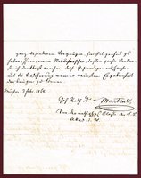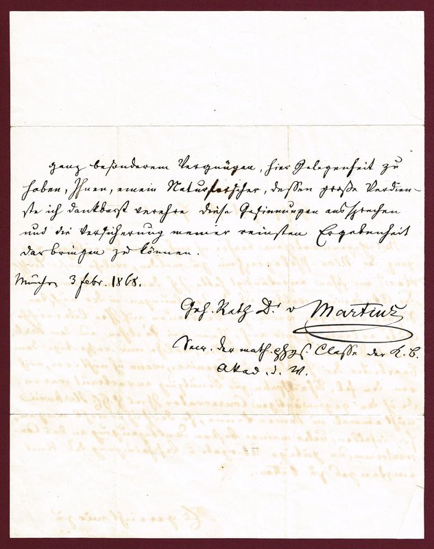 Eigenhändiger Brief mit Unterschrift "Geh[eimer] Rath Dr. v. Martius", 1 1/2 Seiten, kl-4, München, 3. 2. 1868. - Als Sekretär der math.-phys. Klasse der Kgl. Bayerischen Akademie der Wissenschaften an das Großherzogl. Naturalienkabinett in Darmstadt. "Hochgeehrtester Herr! Mit Gegenwärtigem beehre ich mich, Ihnen den richtigen Eingang der Moa-Photographien zu melden, welche unser treffl. Haast mir schon angekündigt hatte. Ich danke im Namen der Akademie, welcher ich die Zeichnungen in der nächsten Sitzung vorlegen werde. Im Vertrauen auf Ihre literarische Güte erlaube ich mir auch, Ihnen ein Päckchen aus dem Herb[arium] ducale Darmst. zugehn zu lassen, welches mir, respective dem Bearbeiter der Gentian. u. Loganiae, wenn ich nicht irre, noch von dem sel. Schnittspahn zur Benützung anvertraut war. Da ich den gegenwärtigen Conservator Ihres G[roß]H[erzog]l[ichen] Herbarii nicht einmal im Namen kenne, so darf ich es wohl wagen, hochdieselben unter meiner besten Danksagung an das Conservatorium, um gütige Übergabe u. Bescheinigung des Rückempfanges zu bitten. / Es gereicht mir zu ganz besonderem Vergnügen, hier Gelegenheit zu haben, Ihnen, einem Naturforscher, dessen große Verdienste ich dankbarst verehre diese Gesinnungen aussprechen und die Versicherung meiner reinsten Ergebenheit darbringen zu können ...". Mit dekorativem Briefkopf der Akademie der Wissenschaften. - Schrift leicht durchschlagend, linke untere Ecke ergänzt.