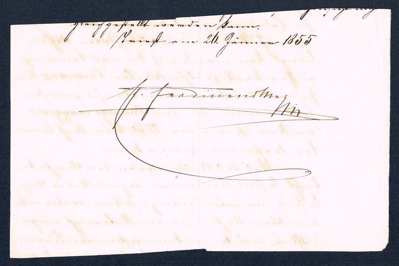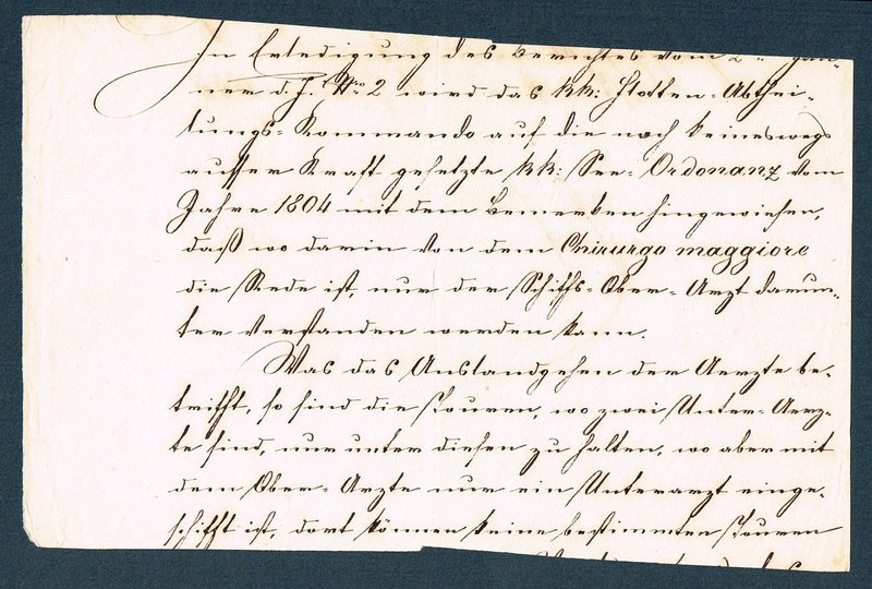 Aktenausschnitt von Schreiberhand mit eigenhändiger schwungvoller Unterschrift als Erzherzog aus seiner Zeit als Marinekommandant, Triest, 26. 1. 1855. - Das Aktenstück betrifft die Stellung des Schiffsoberarztes (Chirurgo maggiore). - Unregelmäßig beschnitten, Schrift leicht durchschlagend.