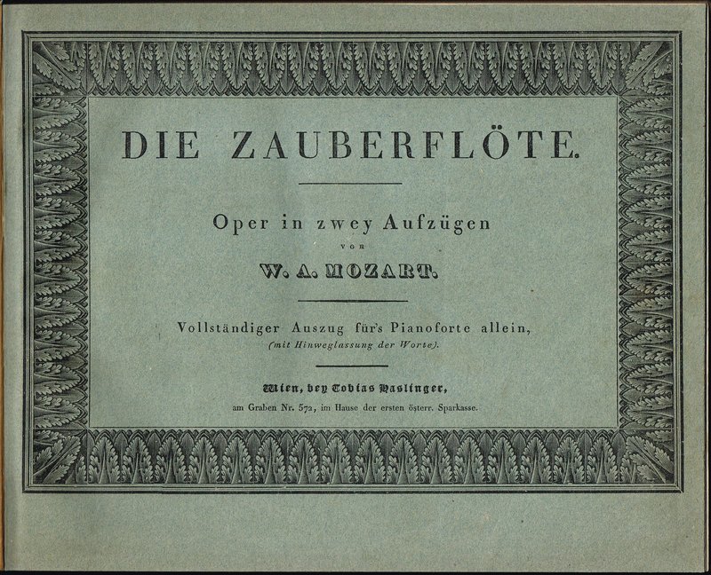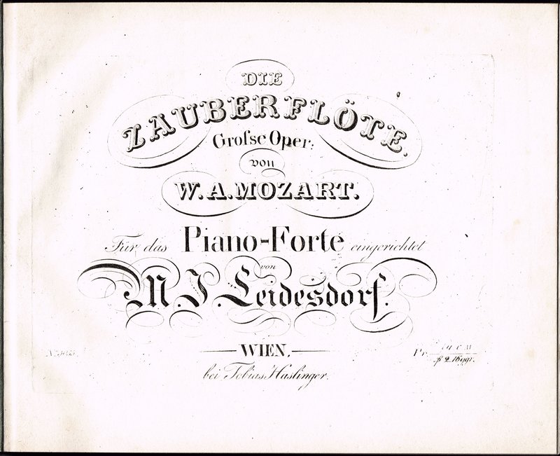 Grosse Oper: von W. A. Mozart. Für das Piano-Forte eingerichtet von M. J. Leidesdorf. Wien, Tobias Haslinger (um 1830). Quer-4; gestochener Titel, 78 pp gest. Noten; späterer schwarzer Leinenband mit goldgepr. Deckel und eingebundenem vorderem Umschlag der Original-Broschur (diese mit etwas abweichendem Titel). - Stellenweise etwas flau gedruckt, einige wenige Flecken und Knickspuren; insgesamt attraktives Exemplar.