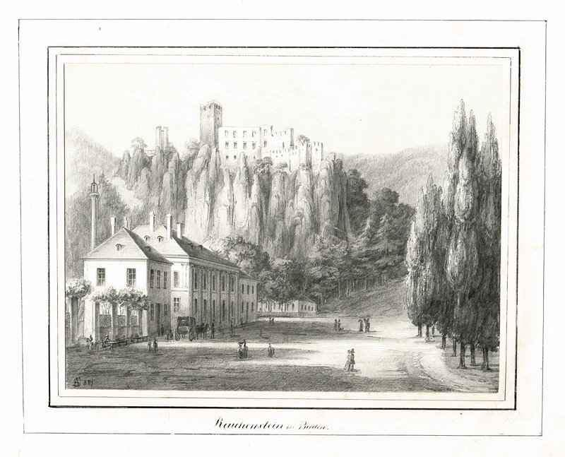 "Rauhenstein bei Baden." Weiß gehöhte Bleistiftzeichnung auf getöntem Karton, links unten monogrammiert und datiert AS (oder SA) [1]854], 14 x 18 cm, auf Papier mit Zierrand montiert. - Fein ausgeführte detailreiche Zeichnung.