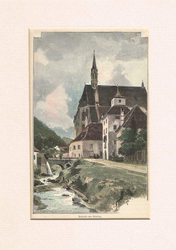 "Kartause von Gaming". Kolorierter Holzstich nach Eduard Zetsche (1891) aus E. Zetsche, Aus den Umgebungen Wiens, 1894, 18 x 11 cm. - Die Klosterkirche Maria Himmelfahrt, davor Straße und Gamingbach.
