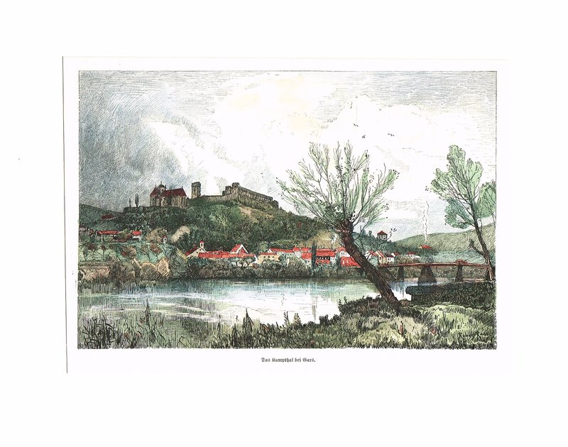 "Das Kampthal bei Gars". Kolorierter Holzstich nach Robert Russ aus "Die österreichisch-ungarische Monarchie in Wort und Bild", Wien 1888, 13 x 19 cm. - Blick über den Kampf auf Thunau mit der Burgruine, die seit 1990 für Opern-Freiluftaufführungen genutzt wird.