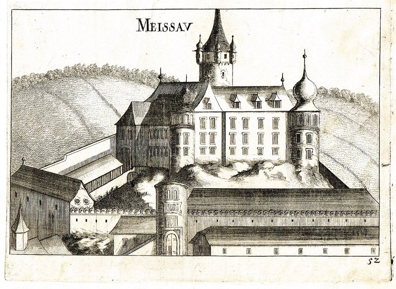 "Meissau". Kupferstich aus G. M. Vischer, Topographia Archiducatus Austriae Inf: Modernae, 1672, 10 x 15 cm. - Das aus dem 12. Jahrhundert stammende Schloss am Nordrand der Stadt, seit 1526 Besitz der Familie Abensberg-Traun. - Restaurierte Randmängel.