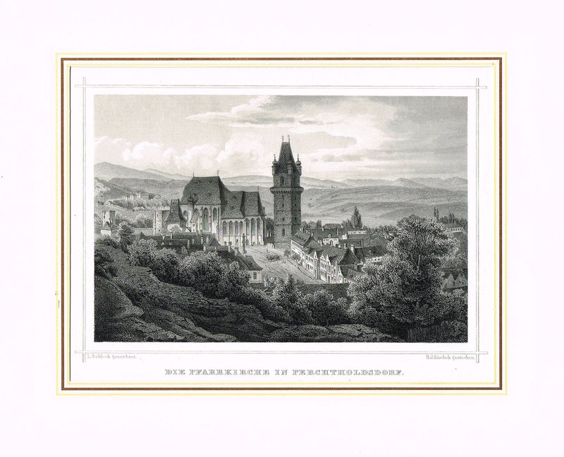 "Die Pfarrkirche in Perchtoldsdorf". Stahlstich von Franz Hablitschek nach Ludwig Rohbock aus Anton von Ruthner, Das Kaiserthum Oesterreich, 1871, 12 x 17 cm.