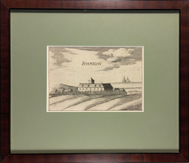 "Schmidau". Kupferstich aus Georg Matthäus Vischer, Topographia Archiducatus Austriae Inf: Modernae, 1672, 10 x 15 cm. - Der bereits im 9. Jh. urkundlich erwähnte Ort im Weinviertel mit dem ab 1548 errichteten, später barockisierten Renaissanceschloss. - Gerahmt.