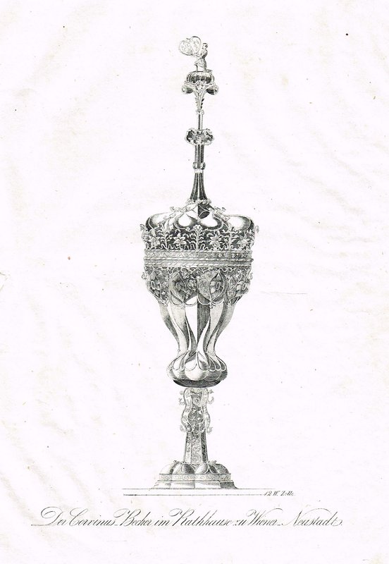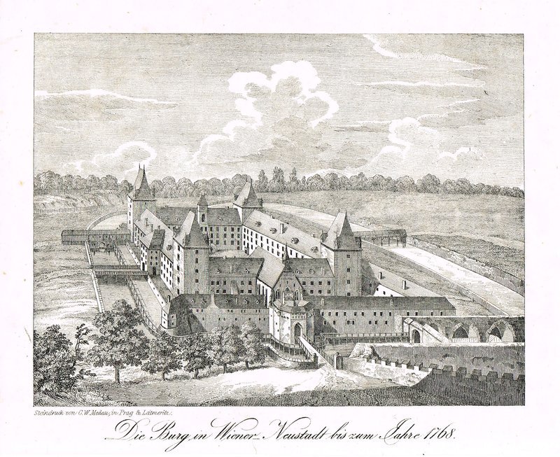 "Die Burg in Wiener-Neustadt bis zum Jahre 1768." Federlithographie bei Carl Wilhelm Medau aus "Erinnerungen an merkwürdige Gegenstände und Begebenheiten ..." 24. Jahrgang, 1844, 15 x 19,5 cm; unbedeutender kleiner Randriss im Textfeld. - Historische Darstellung des Zustandes vor dem Erdbeben von 1768; zugehöriger Text (von Eduard Breier) beiliegend. - Dazu als Beigabe: "Der Corvinus-Becher im Rathhause zu Wiener-Neustadt." Federlithographie aus demselben Band, ebenfalls mit zugehörigem Text.