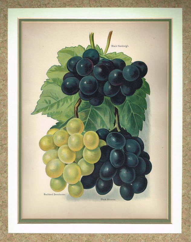 "Black Hamburgh - Buckland Sweetwater - Black Alicante." Chromolithographie aus John White, The Fruit Grower's Guide, London 1891, Blattgröße 27,5 x 21 cm.