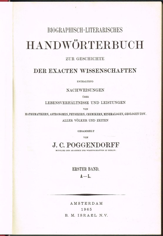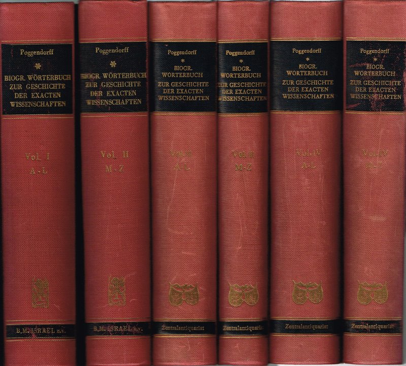 Biographisch-literarisches Handwörterbuch zur Geschichte der exacten Wissenschaften enthaltend Nachweisungen über Lebensverhältnisse und Leistungen von Mathematikern, Astronomen, Physikern, Chemikern, Mineralogen, Geologen usw. aller Völker und Zeiten. 4 in 6 Bänden. Amsterdam, B. M. Israel, um 1965. Gr-8; insgesamt ca. 4770 Seiten (in Spalten gedruckt und teilweise auch so paginiert); Orig.-Leinenbände mit goldgepr. Rücken und Rückenschildchen (Vorsätze leicht gebräunt); Einbände etwas berieben, Fußschnitte leicht angeschmutzt, innen ohne nennenswerte Gebrauchsspuren.