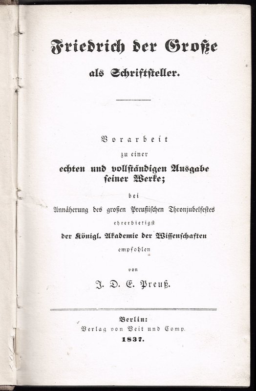Friedrich der Große als Schriftsteller. Vorarbeit zu einer echten und vollständigen Ausgabe seiner Werke. Berlin, Veit & Comp., 1837. In-8; X, 359 pp; etwas späterer Leinenband mit goldgepr. Rückentitel (berieben, oberes Kapital leicht beschädigt, Bibl.-Schildchen); einzelne unbedeutende Gebrauchsspuren.