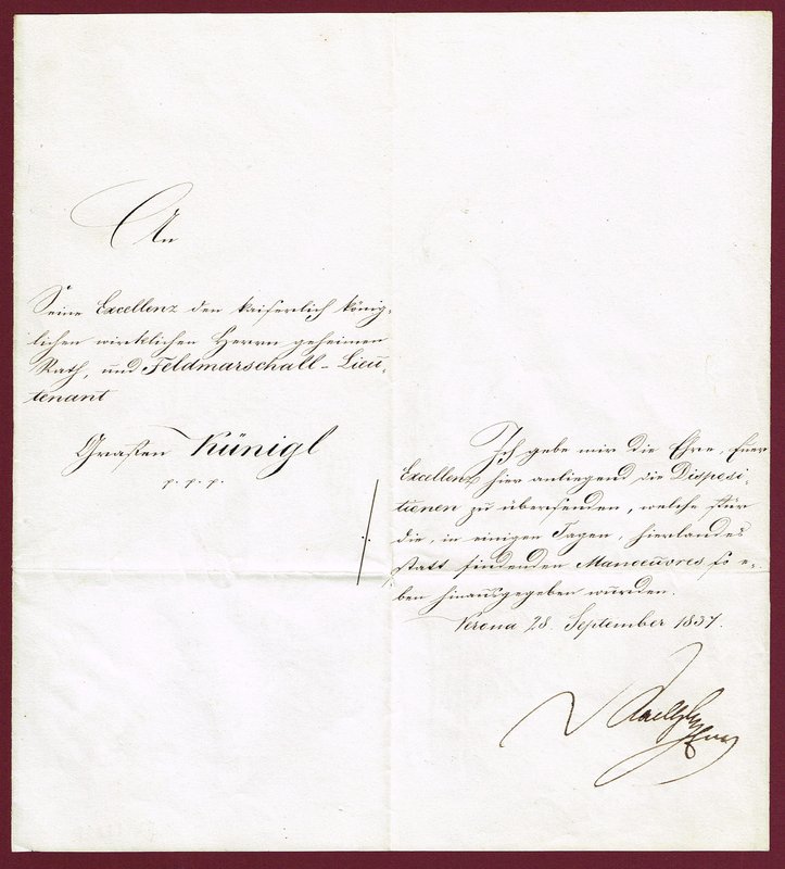 Kanzleibrief mit eigenhändiger Unterschrift ("RadetzkyFm"), kl-4, Verona, 28. 9. 1837. - An Feldmarschall-Leutnant Graf Künigl. "Ich gebe mir die Ehre, Euer Excellenz hier anliegend die Dispositionen zu übersenden, welche für die, in einigen Tagen, hierlandes statt findenden Manoeuvres so eben hinausgegeben wurden ...". Ohne die erwähnten Beilagen. - Faltspuren.