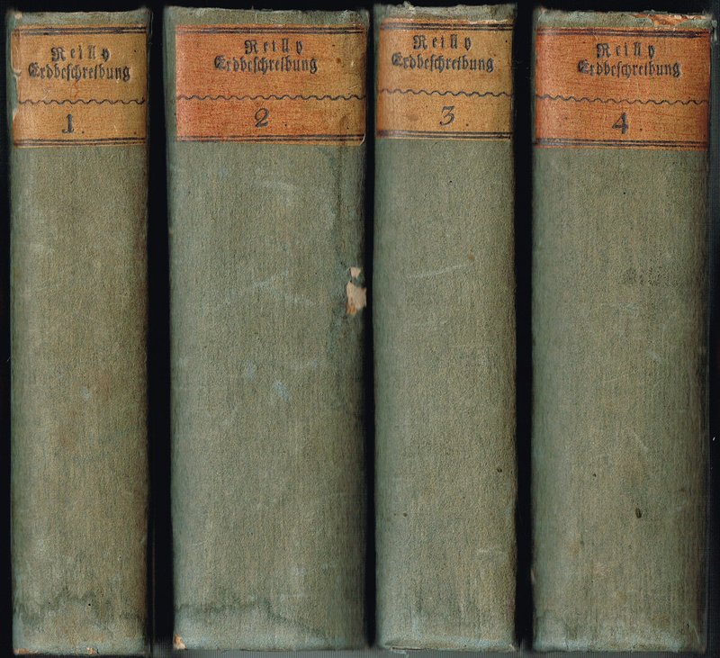 Allgemeine Erdbeschreibung / Geschöpft aus Büsching, Fabri, Bruns und andern Erd- und Reise-Beschreibern. 3 Teile in 4 Bänden. Wien, Verlag des Herausgebers, 1792-1793. Kl-8; Titel mit Kartenvignette, 566 pp; Titel mit Kartenvignette, 1263 pp; Titel mit Globenvignette, 718 pp; Pappbände der Zeit mit Rückenschildchen Rückenschildchen (etwas fleckig und leicht bestoßen, kleine Fehlstellen); gelegentlich etwas gebräunt, vereinzelte Wurmspuren, insgesamt gut erhalten. - Auf den vorderen Außen- und Innendeckeln Bibilotheksschildchen des Kremser Piaristen-Gymnasiums.