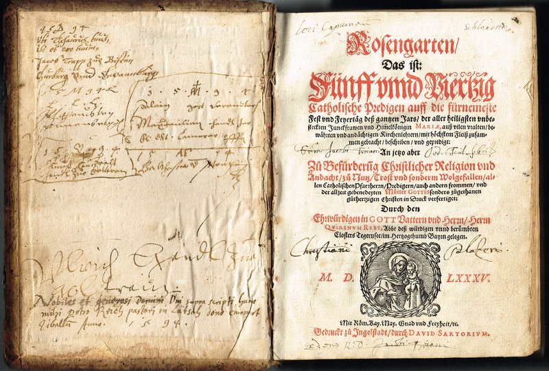 Rosengarten, Das ist: Fünff unnd Viertzig Catholische Predigen auff die fürnemeste Fest und Feyertäg deß gantzen Jars, der aller heiligsten unbefleckten Junckfrawen und Him[m]elkönigin Mariae, auß vilen uralten, bewährten und andächtigen Kirchenlehrern, mit höchstem Fleiß zusammen gebracht, beschriben, und gepredigt ... Ingolstadt, David Sartorius, 1585. In-8; 12 Bll. (inkl. Titel rot-schwarz), 543, (1) pp, 9 Bll. Register, 1 Bl.; einige Vignetten; Lederband der Zeit auf vier Bünden über Holzdeckeln mit reicher Blindprägung und zwei Messingschließen (etwas fleckig, ohne fliegende Vorsätze, stellenweise im Falz geringfügig gelockert, eine Schließe unvollständig); durchgehend leicht gebräunt, mehrere alte Besitzvermerke auf Spiegel und Titel, teilweise etwas fleckig (vereinzelt stärker); eine herausgerissene Seite (131/132) durch Faksimile ersetzt; insgesamt gutes Exemplar.