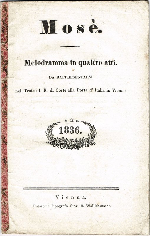 Mosè. Melodramma in quattro atti. Da reppresentarsi nel Teatro I. R. di Corte alla Porta d'Italia in Vienna. Wien, Wallishausser, 1836. In-8; 27 pp mit Titelvignette; orig. Fadenheftung mit Buntpapierrücken (ohne Umschlag); Gebrauchs- und Altersspuren, die letzte weiße Seite stärker angeschmutzt.