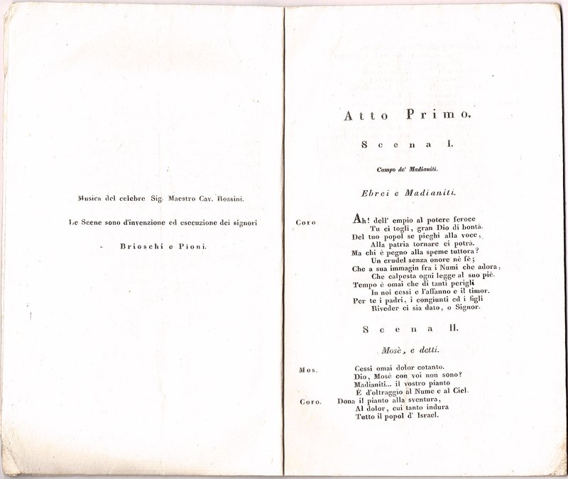 Textbuch zu Aufführungen einer Rossini-Oper im Wiener Kärntnertortheater; für die Ausstattung zeichneten der Dekorationsmaler Giuseppe Brioschi (1801-1858) und sein Kollege Pioni verantwortlich. "Mosè in Egitto" (so der ursprüngliche Titel) nach einem Libretto von Andrea Leone Tottola wurde 1818 in Neapel uraufgeführt. 1827 folgte eine überarbeitete und stark erweiterte französische Fassung, die später wieder ins Italienische rückübersetzt wurde. Der vorliegende Wiener Druck, der bis in die Angabe von Aufführungsort und Verlag hinein italienisiert ist, dürfte auf einer 1836 bei Bisesti in Verona gedruckten Textausgabe basieren.